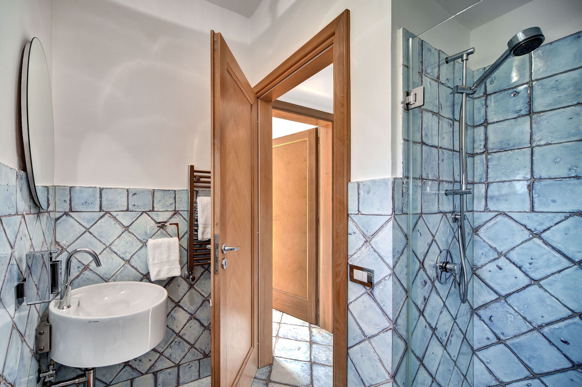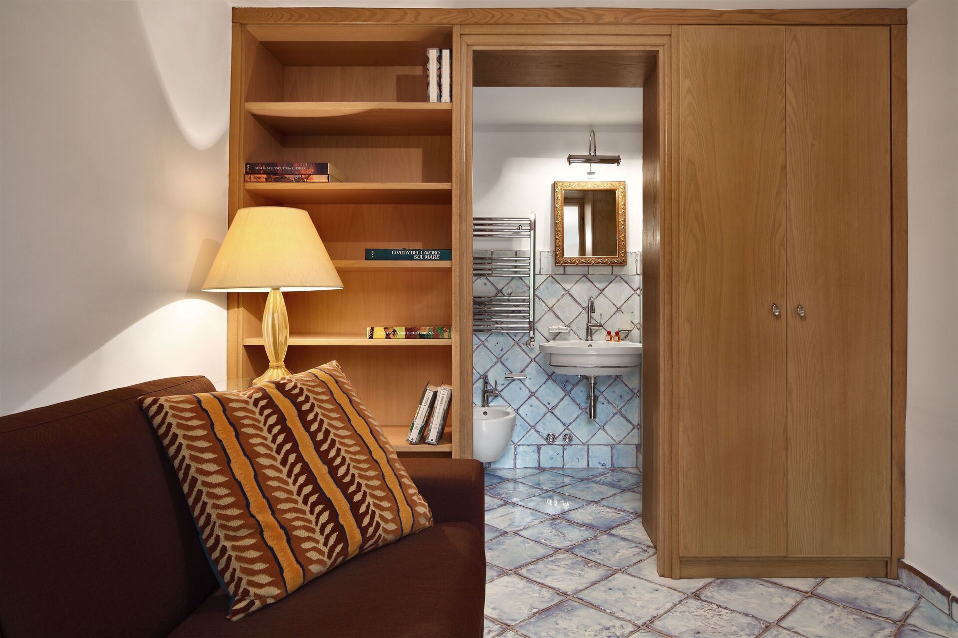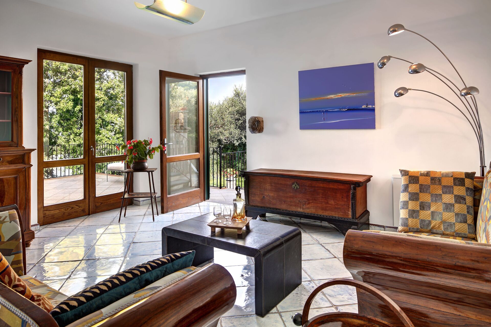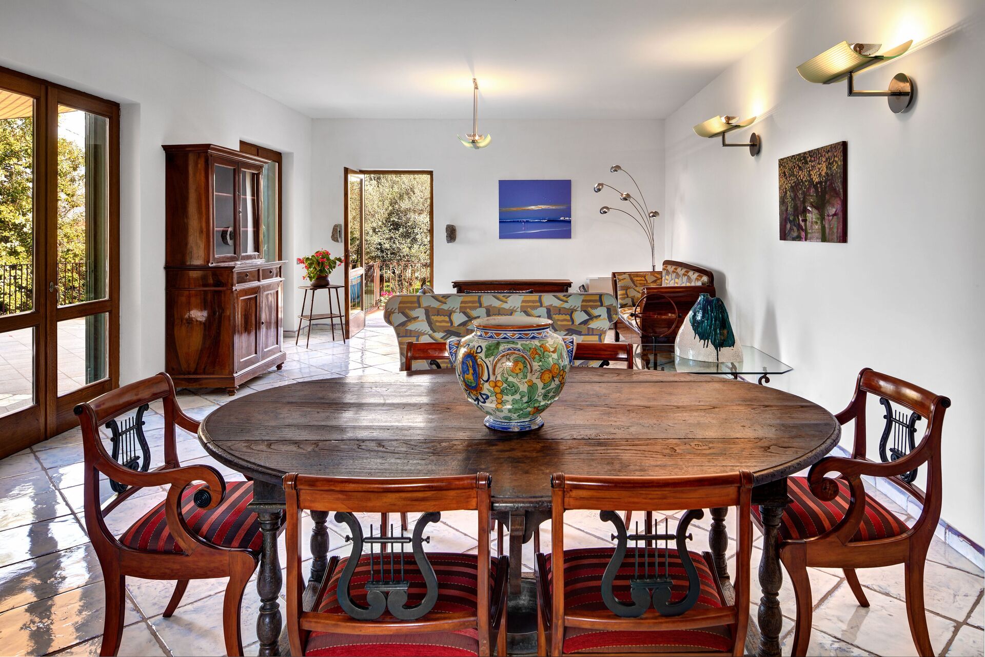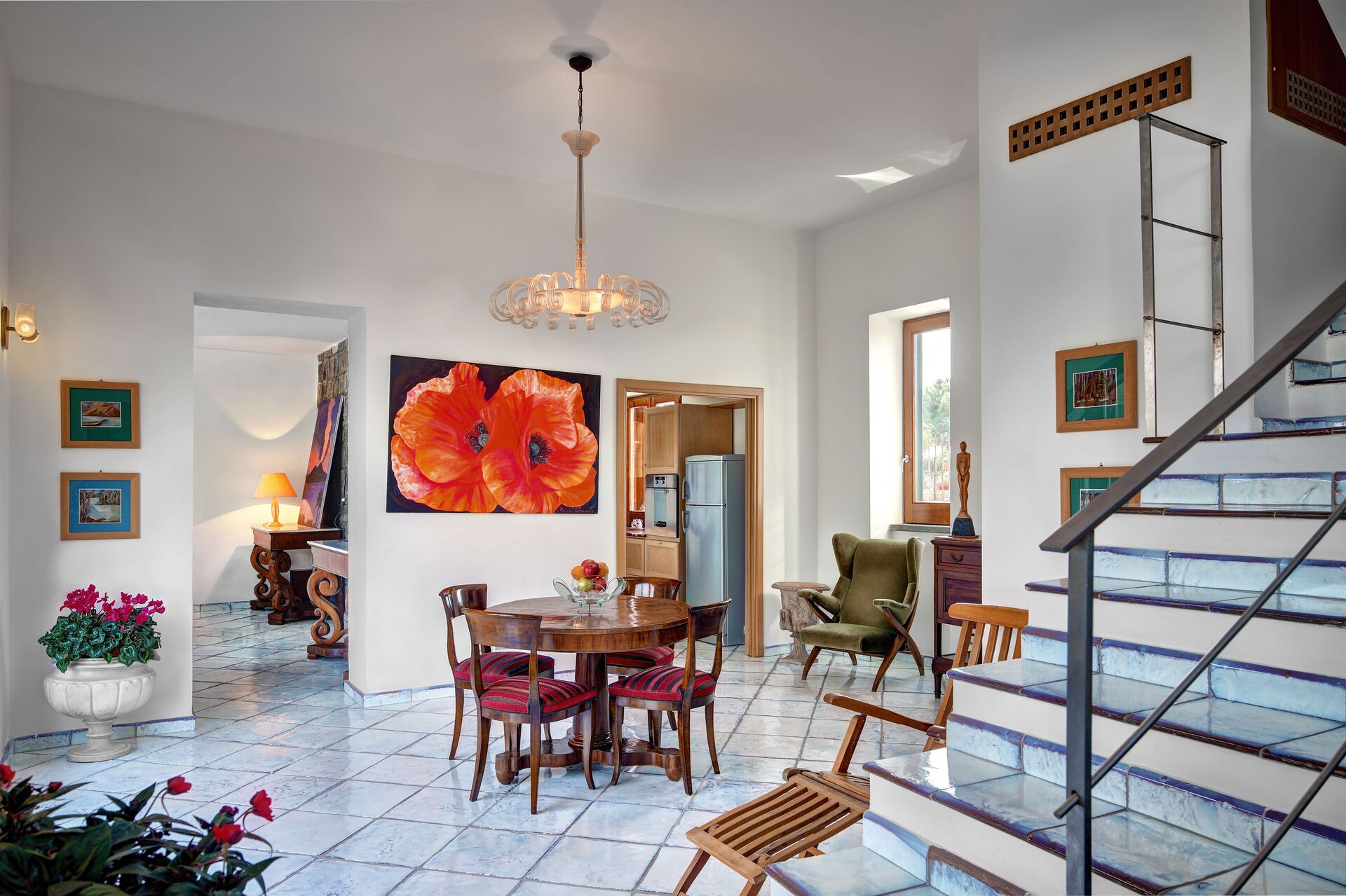 L'ingresso alla villa può essere paragonato a quello di entrare in una galleria d'arte con i suoi superbi dipinti contemporanei e classici. Le aree soggiorno e pranzo a pianta aperta sfociano in una terrazza privata con vista mozzafiato sul Vesuvio. È l'ambiente perfetto per sorseggiare un cocktail mentre si assapora il tramonto sul Mediterraneo. La grande cucina con panca ad isola è completamente attrezzata per lo chef appassionato e include una cucina a gas a 6 fuochi, lavastoviglie, frigorifero e tutti gli utensili da cucina necessari. Adiacente alla cucina è un piccolo bagno con lavatrice, ferro e asse da stiro e zona lavaggio. Attraverso la porta ad arco che avvolge la terrazza esterna si trova una sala da pranzo formale e una seconda sala soggiorno / TV molto accogliente situata al piano inferiore con pareti di roccia vulcanica esposta (tufo).