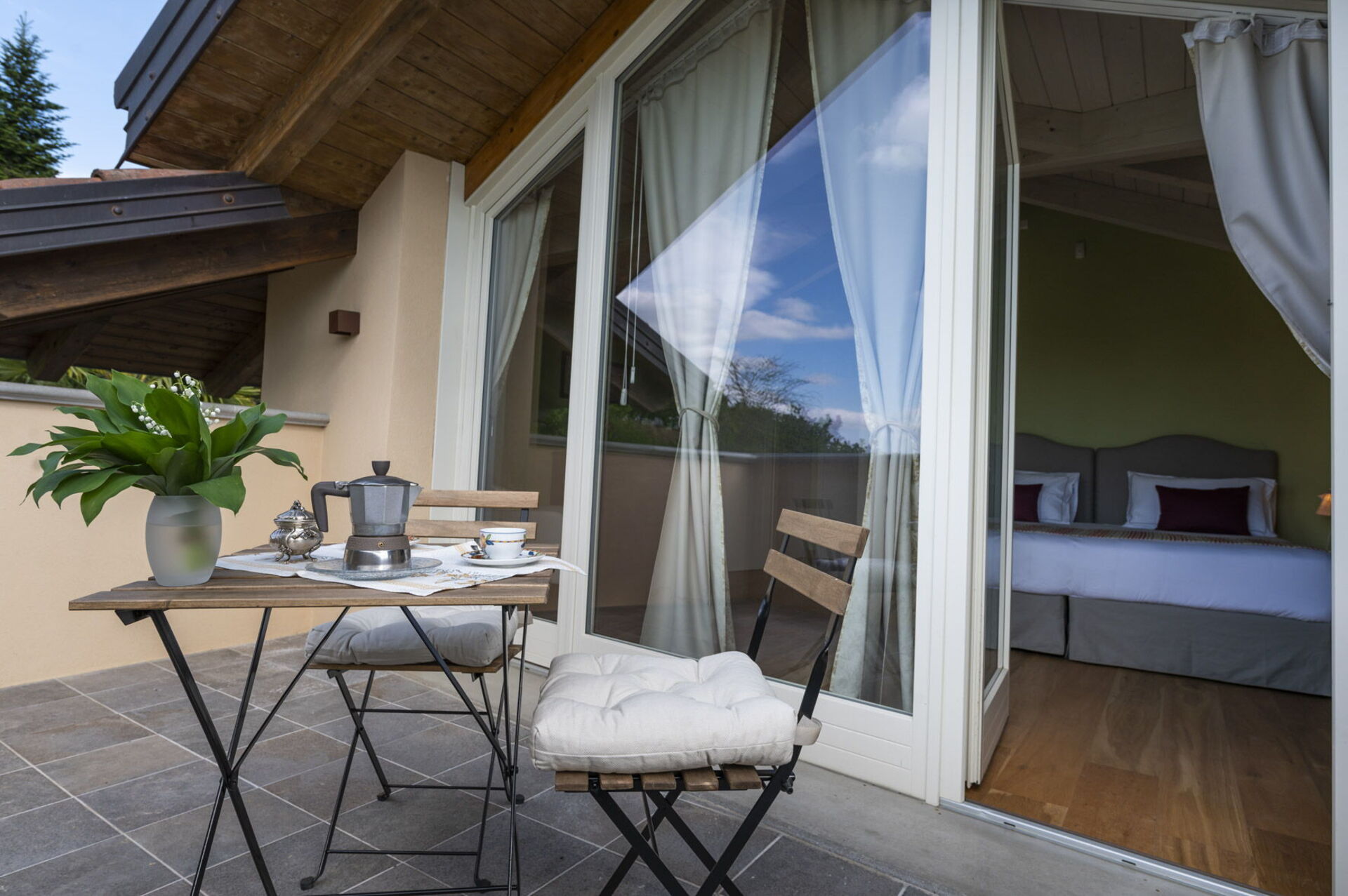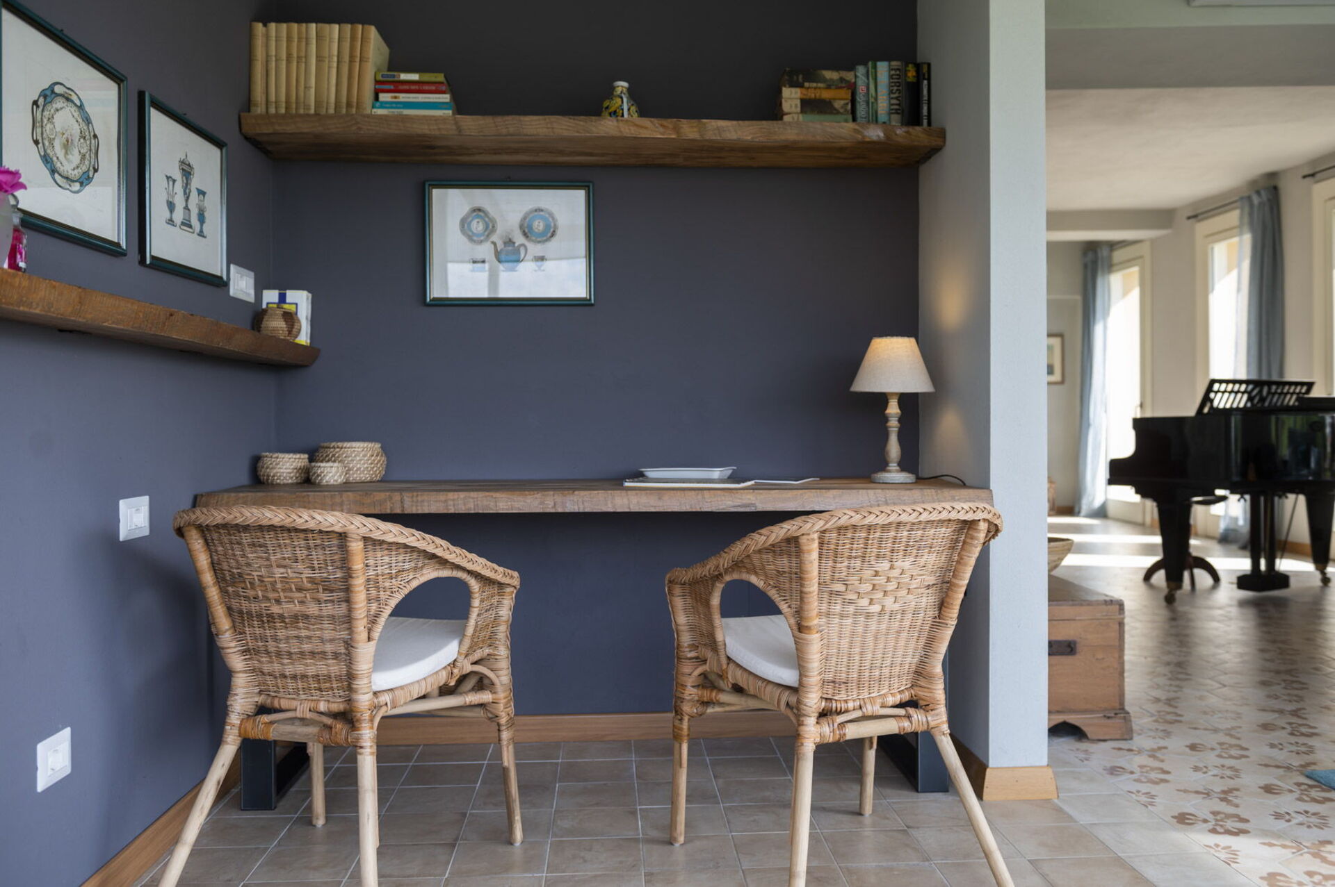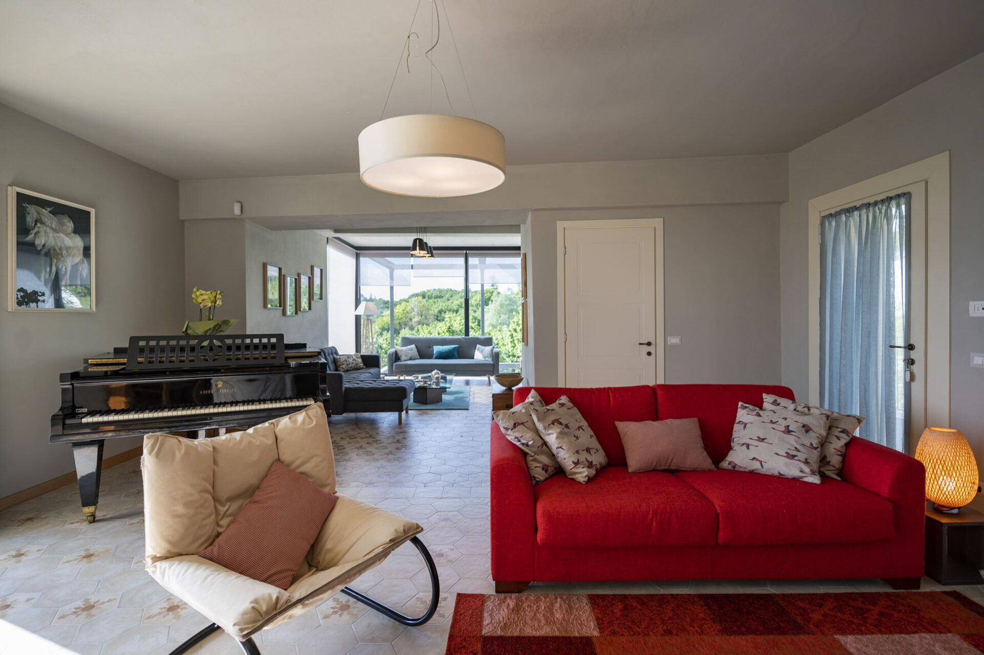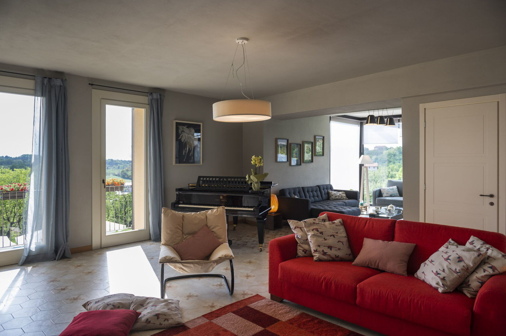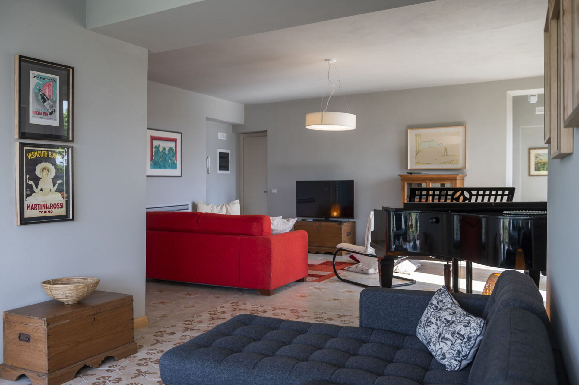 Al primo piano un ampio soggiorno con un bellissimo pianoforte, due camere matrimoniali con bagno ensuite, balcone e terrazza.