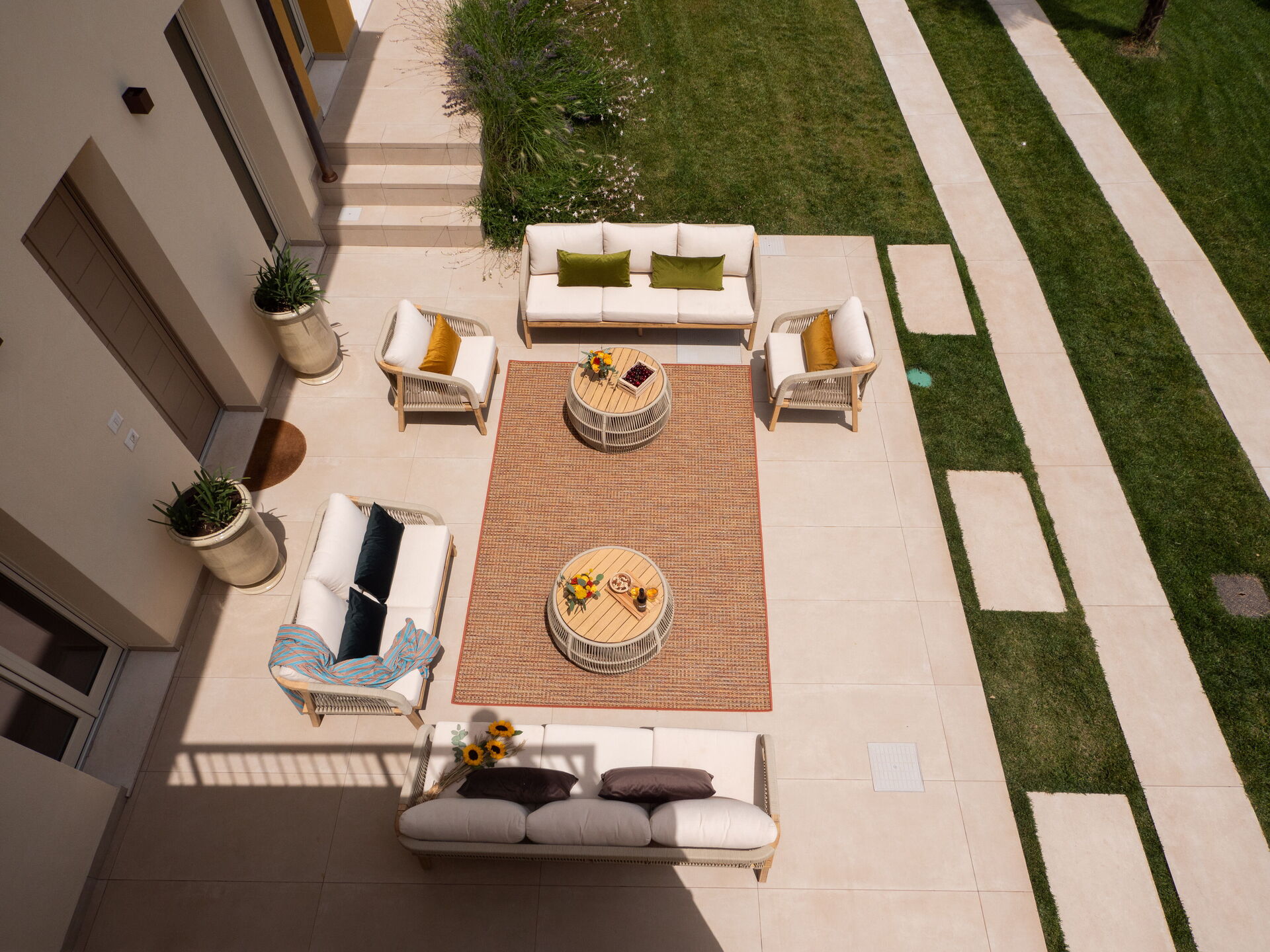 Al piano terra, la villa si apre su una zona soggiorno ampia e accogliente, arredata con comodi divani. La cucina è spaziosa e moderna ben attrezzata e provvista di ogni necessità. La sala da pranzo è arredata con un elegante pianoforte, aggiungendo un tocco di raffinatezza all'ambiente. C'è anche un bagno, completo di servizi igienici e lavandino, per la massima comodità degli ospiti. Sempre al piano terra, tre camere matrimoniali, in due di queste ci sono altri 2 posti su divani letto. Ciascuna camera ha il proprio bagno privato provvisto di doccia.
