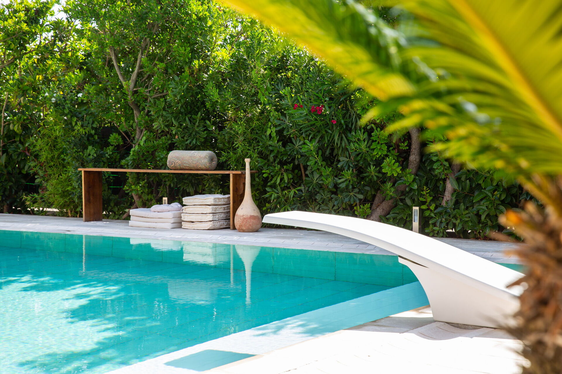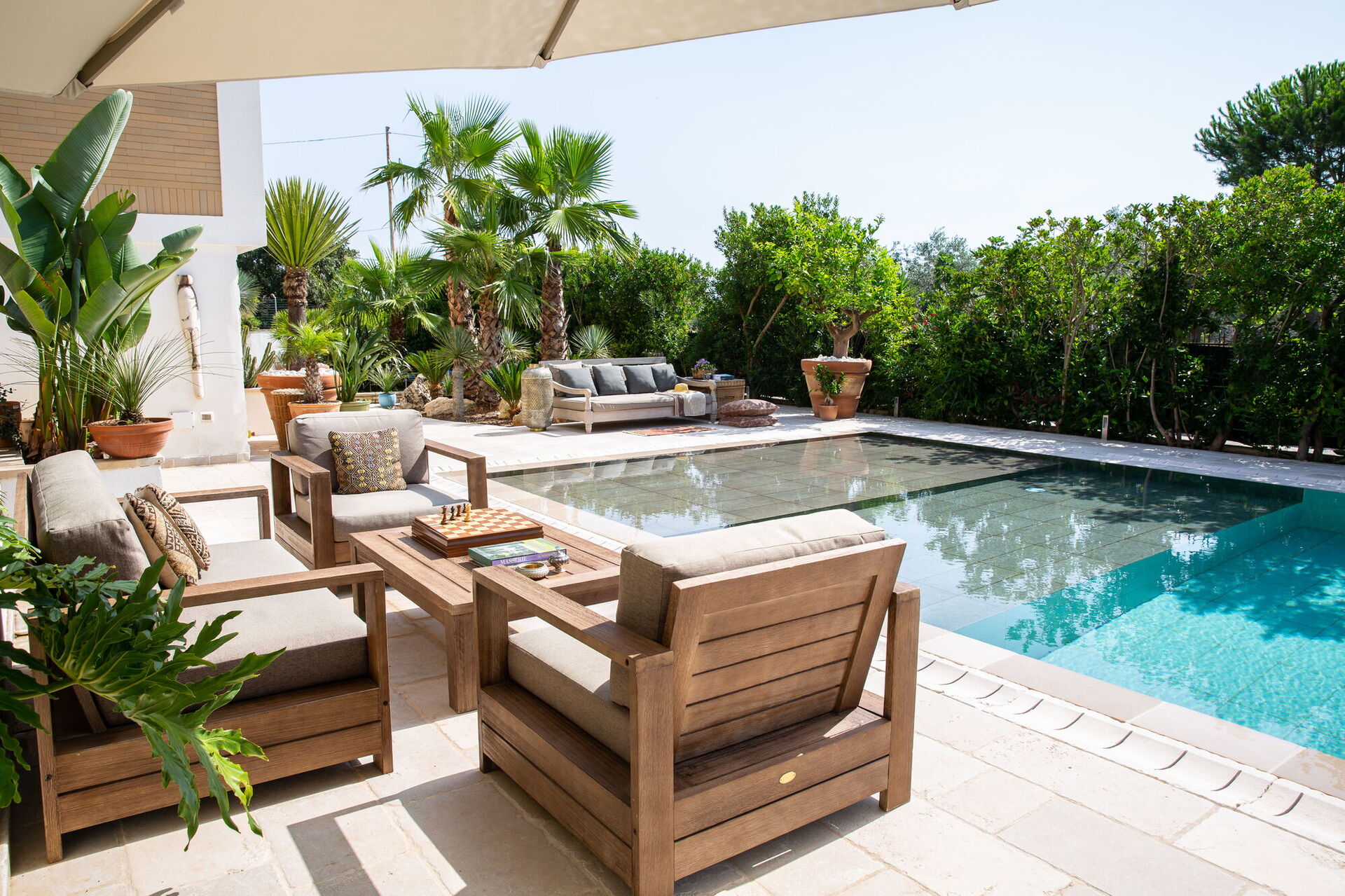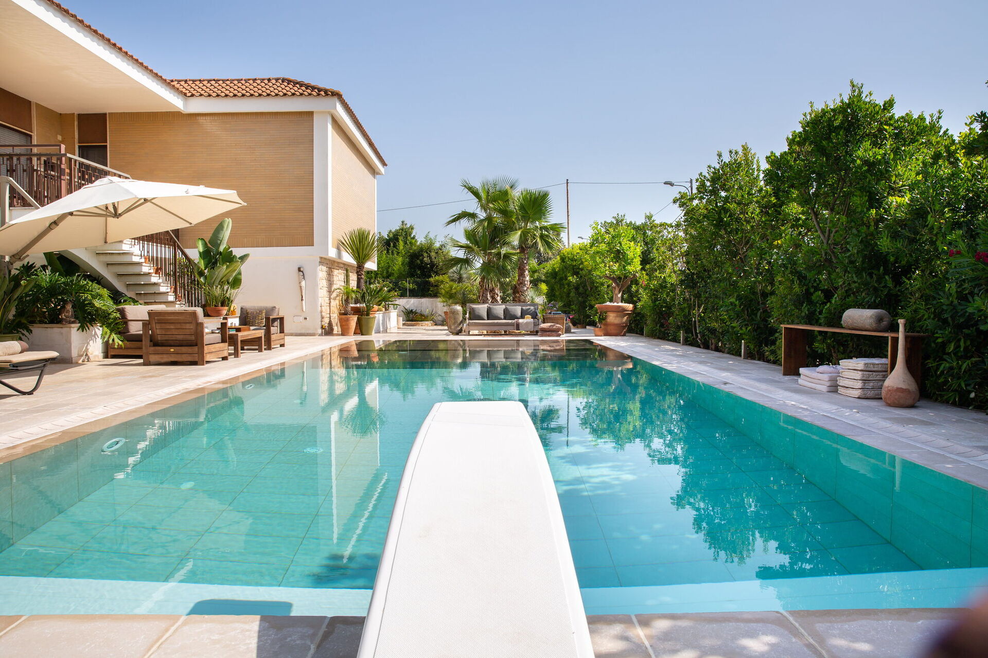Completamente circondata da balconi vista giardino, la Villa vi accoglierà nei suoi verdeggianti spazi aperti tra alberi di palme e alte siepi che vi garantiranno privacy assoluta. A vostra disposizione una straordinaria piscina con trampolino la cui vasca è disposta su più livelli risultando così adatta anche ai bambini. Su di essa si apre un gande patio dotato di divani, poltrone e tavolinetti. A bordo piscina pure un bel solarium in pietra con lettini prendisole e ombrelloni.