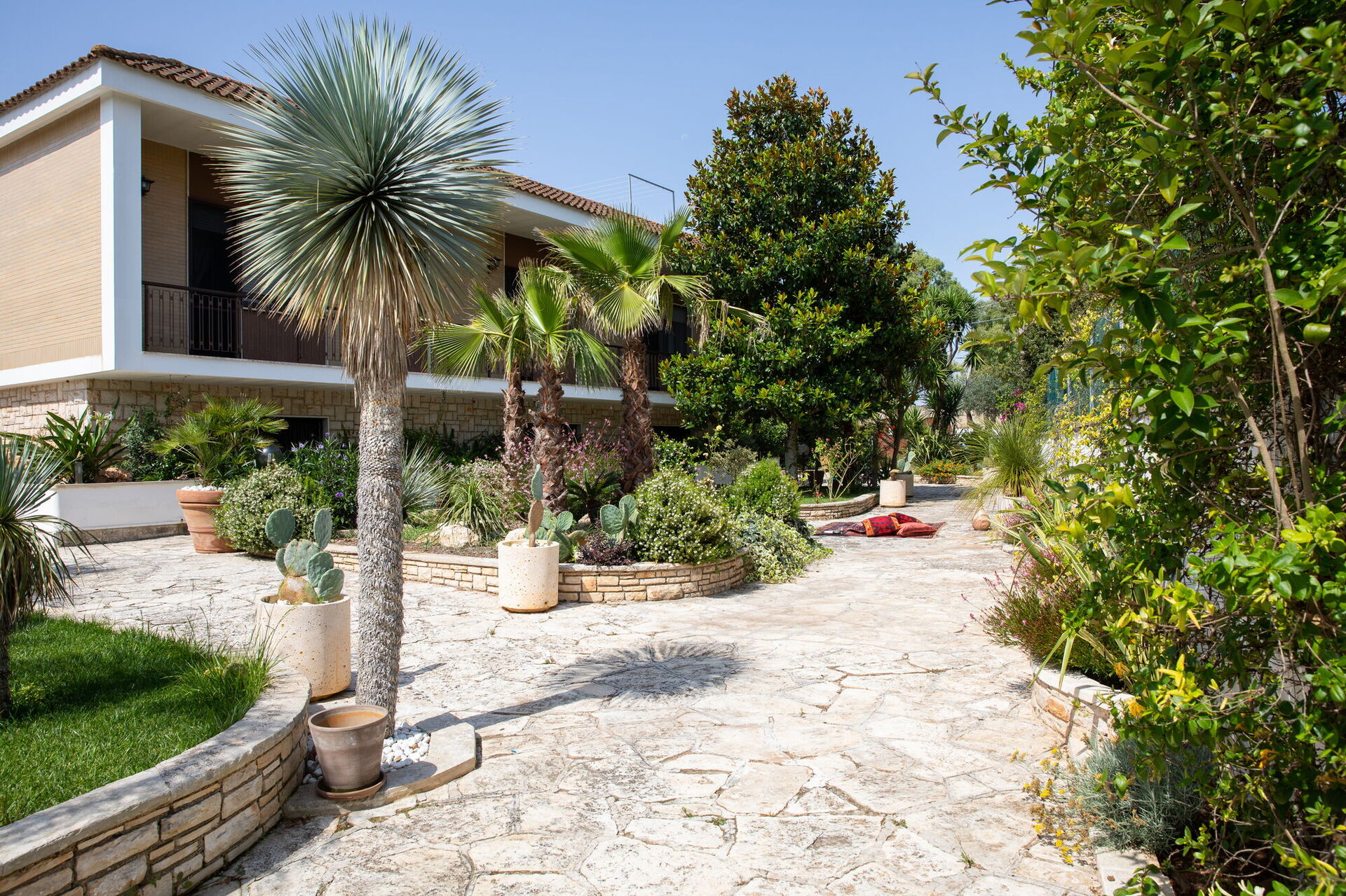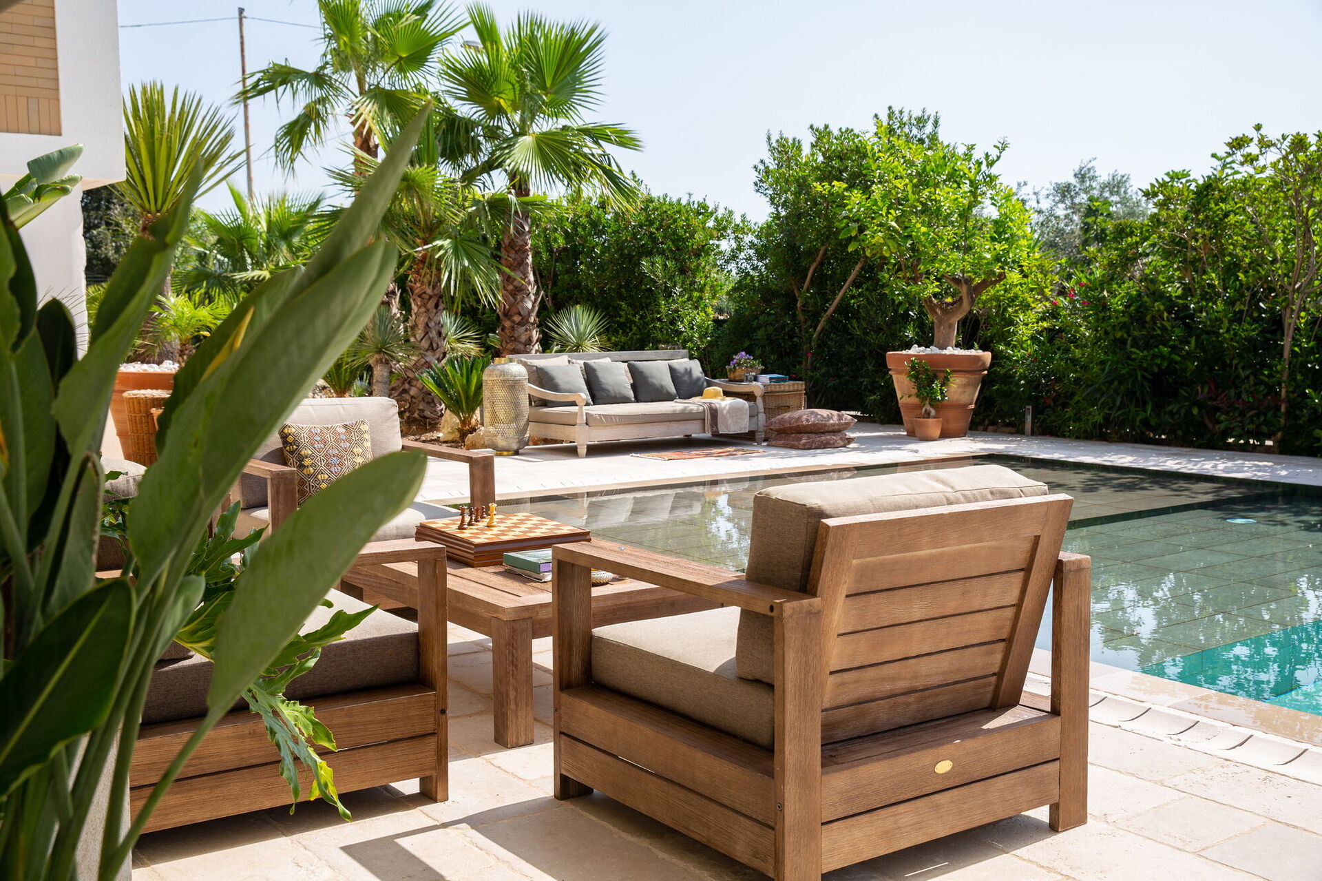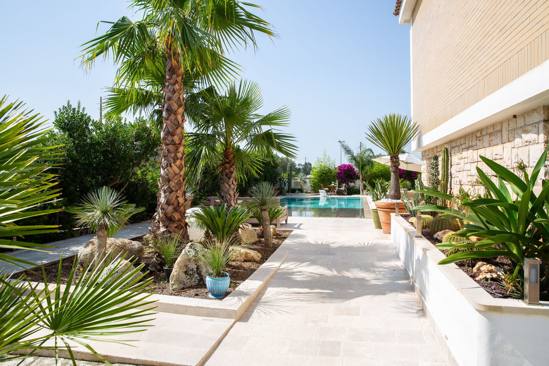 Completamente circondata da balconi vista giardino, la Villa vi accoglierà nei suoi verdeggianti spazi aperti tra alberi di palme e alte siepi che vi garantiranno privacy assoluta. A vostra disposizione una straordinaria piscina con trampolino la cui vasca è disposta su più livelli risultando così adatta anche ai bambini. Su di essa si apre un gande patio dotato di divani, poltrone e tavolinetti. A bordo piscina pure un bel solarium in pietra con lettini prendisole e ombrelloni.