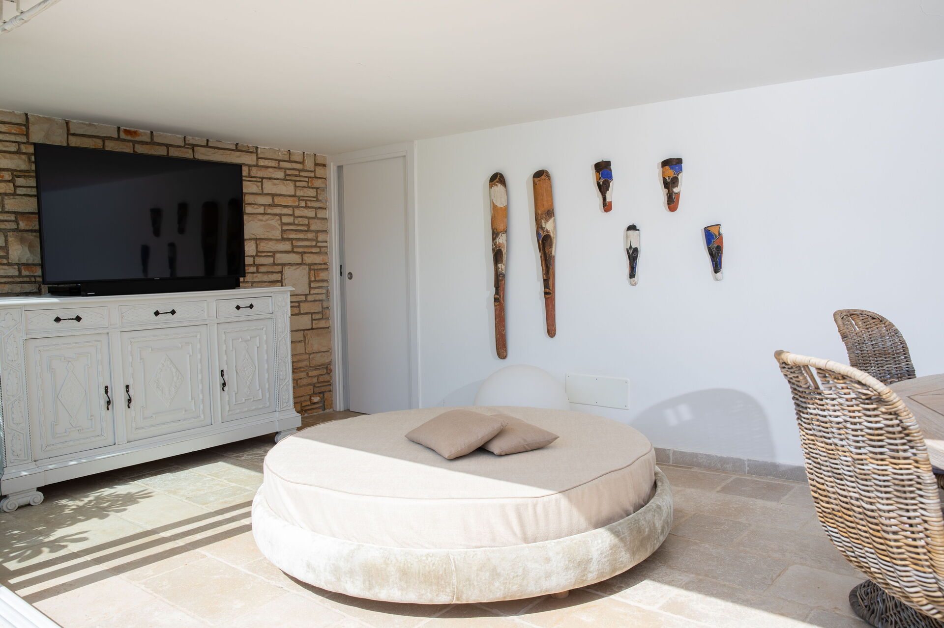 A servizio dell’area esterna anche uno spazio modulabile con tavolo rotondo e poltrone in vimini per 6 persone e una grande e luminosa cucina con frigo all’americana a doppia battuta, lavastoviglie, forno, microonde, lavandino e macchina da caffè. Sempre all’esterno è presente anche un’area barbecue.