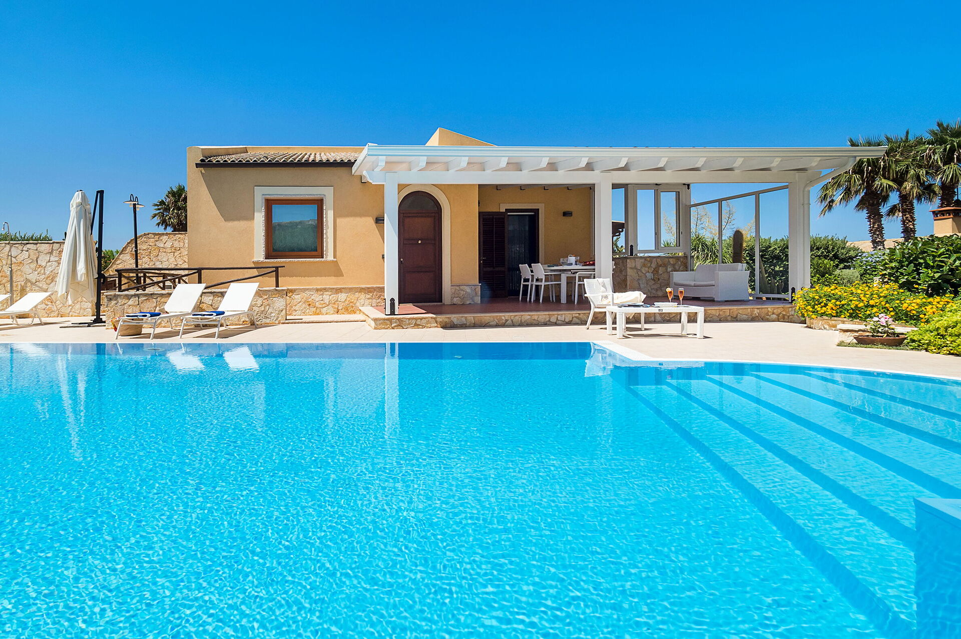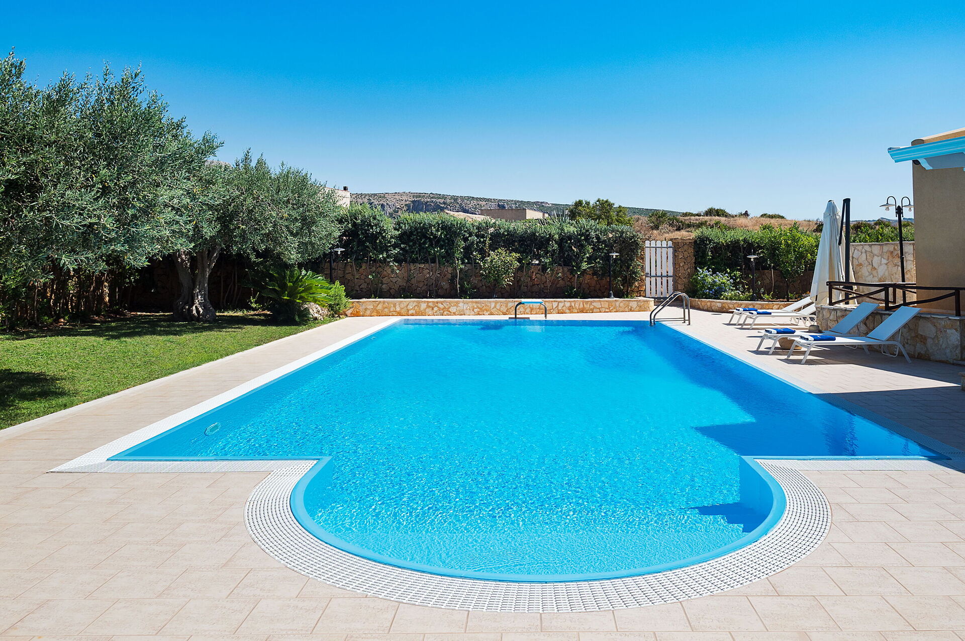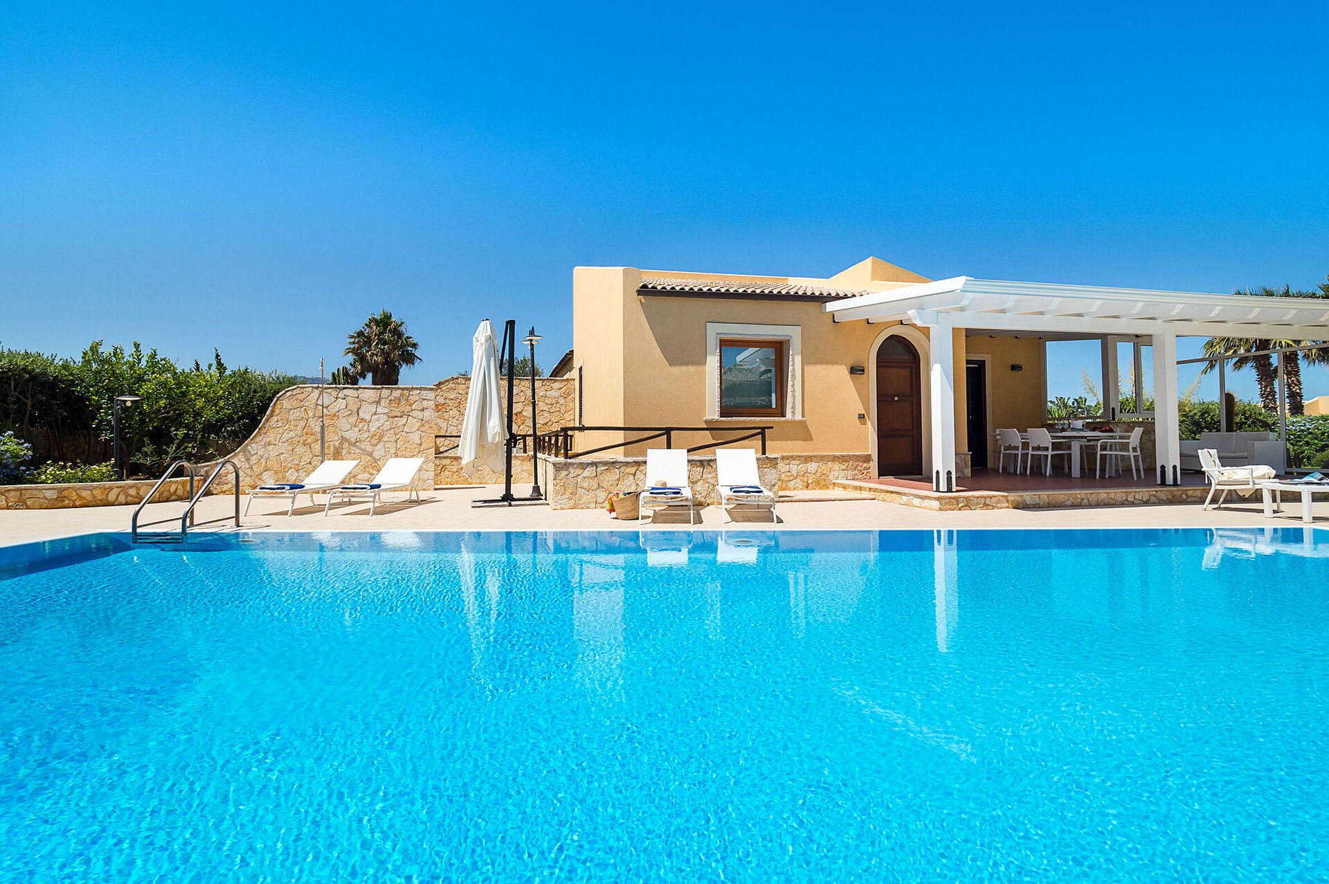 Lo spazio esterno della villa è caratterizzato dalla bellissima piscina privata (dimensioni:12,00 x 6,00 profondità: 1,20-2,70) arredata con sdraio, ombrelloni e doccia esterna a disposizione esclusiva degli ospiti.