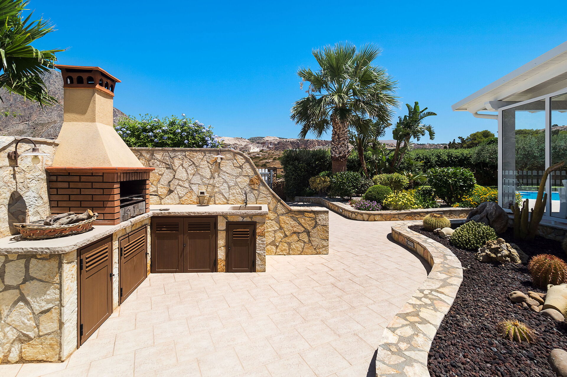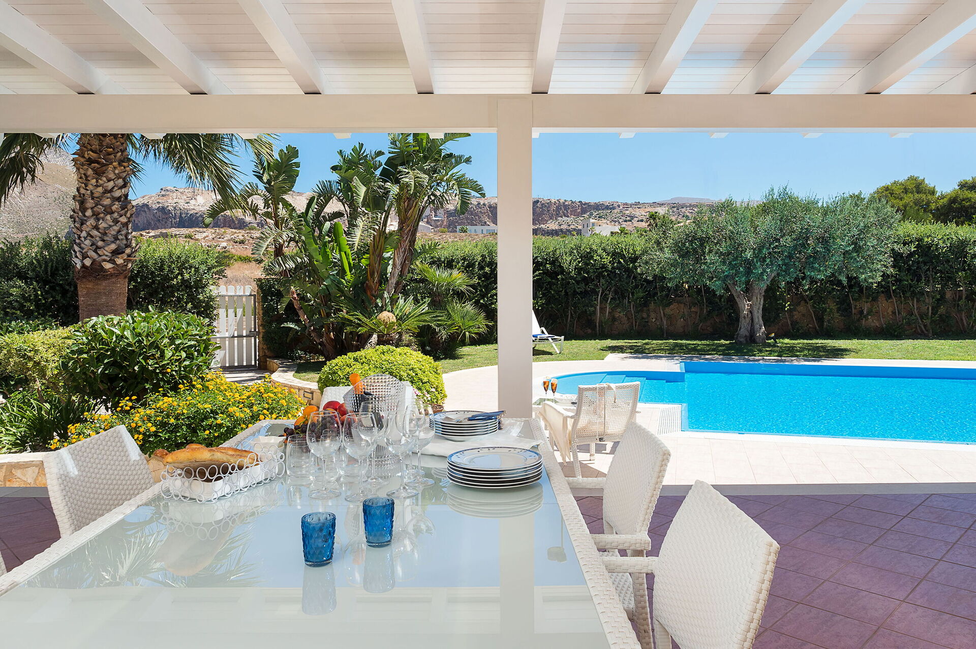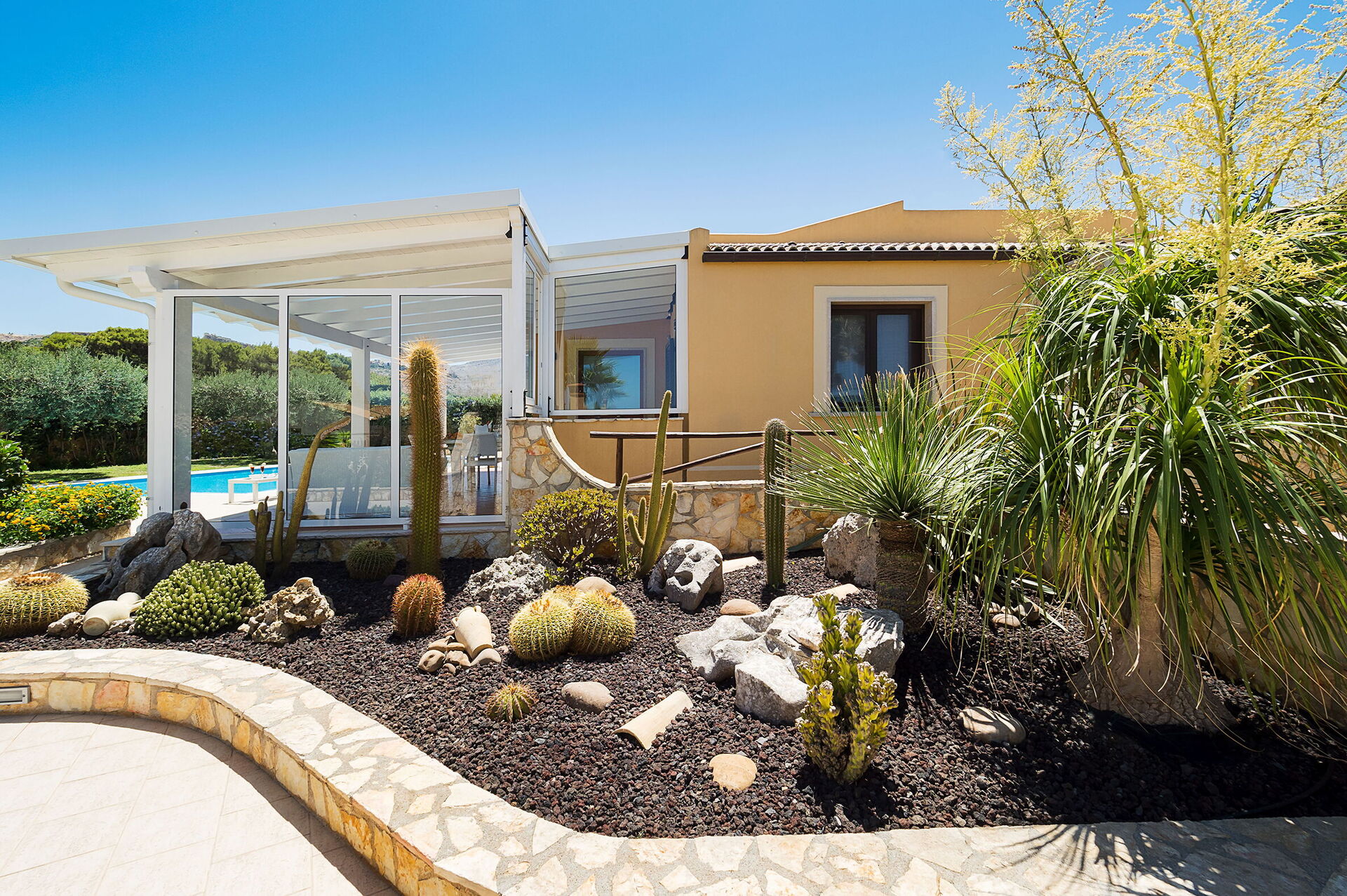 Lo spazio esterno della villa è caratterizzato dalla bellissima piscina privata (dimensioni:12,00 x 6,00 profondità: 1,20-2,70) arredata con sdraio, ombrelloni e doccia esterna a disposizione esclusiva degli ospiti.