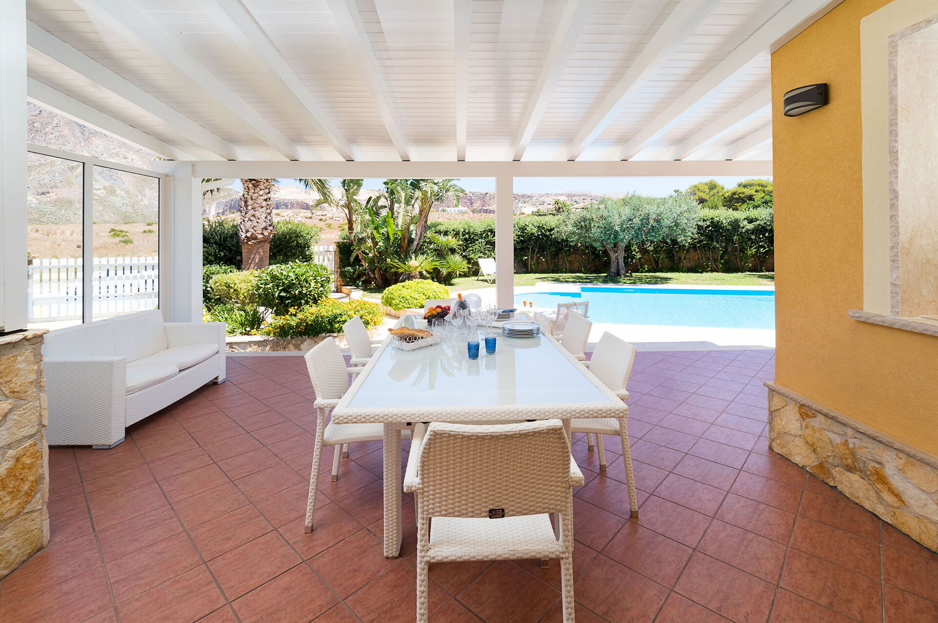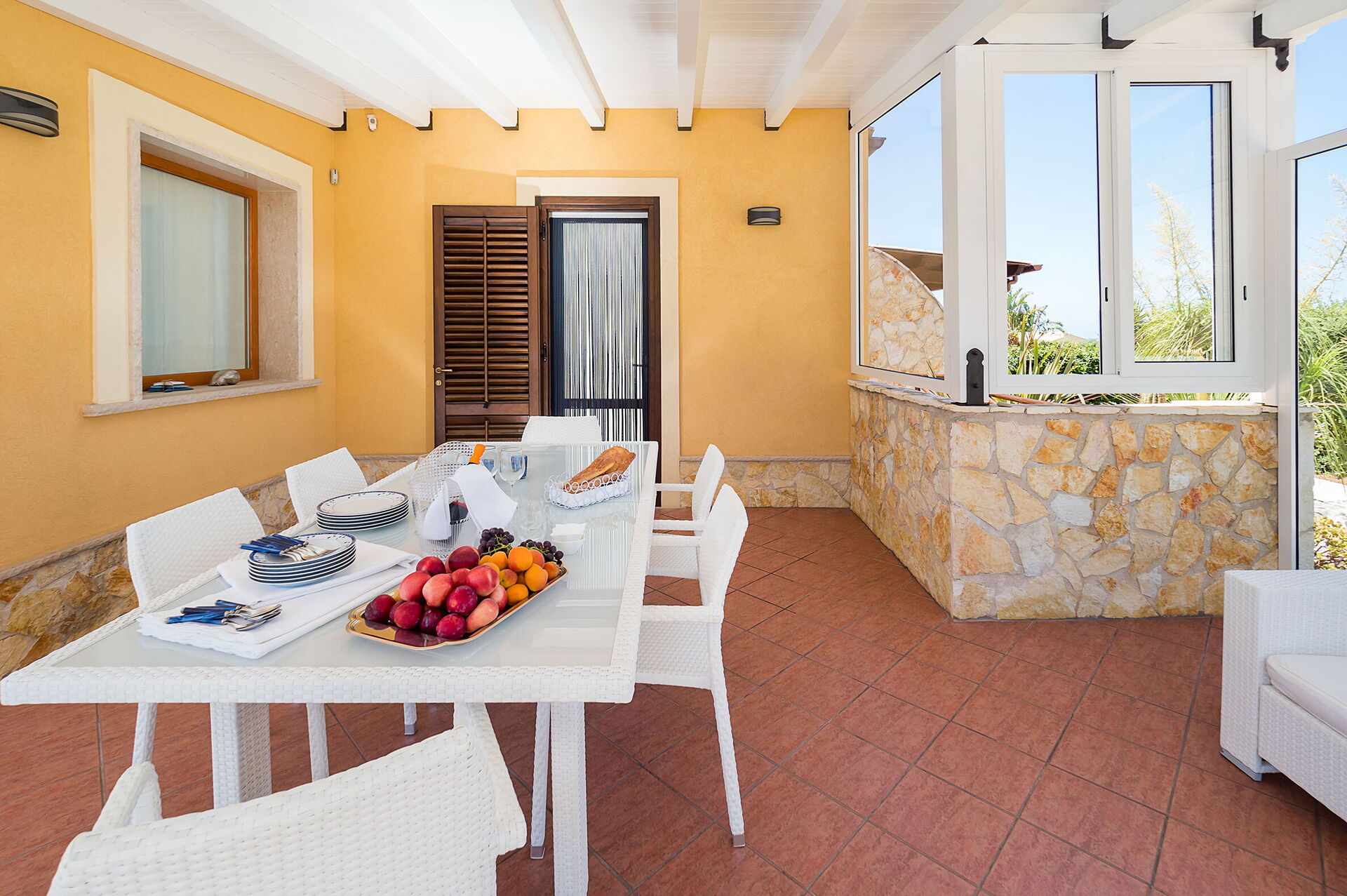 La veranda ombreggiata è arredata con tavolo e sedie per mangiare all'aperto, più il comodo divano per rilassarsi. Inoltre presente zona barbecue e giardino.