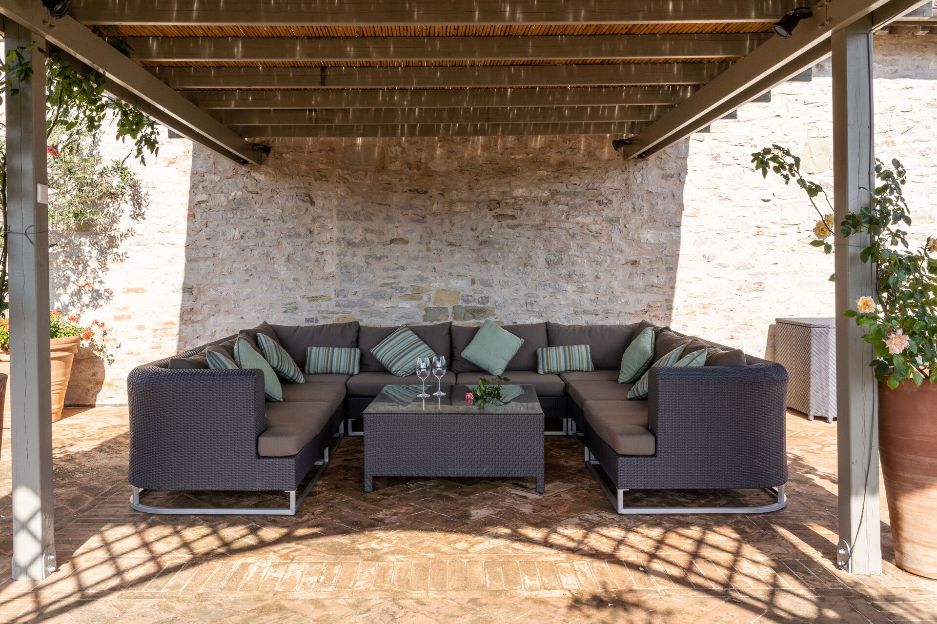 Vicino alla piscina, una suggestiva pergola offre un rifugio ombroso dal caldo sole estivo, il luogo perfetto per rilassarsi e godersi la bellezza circostante.