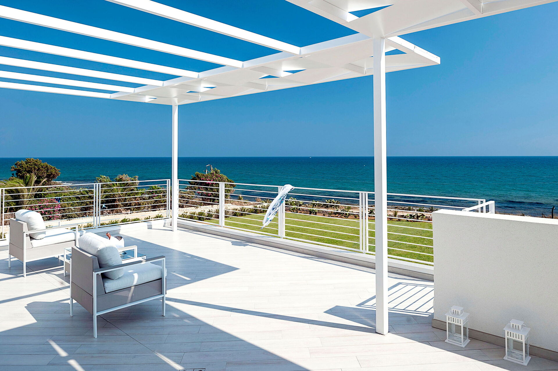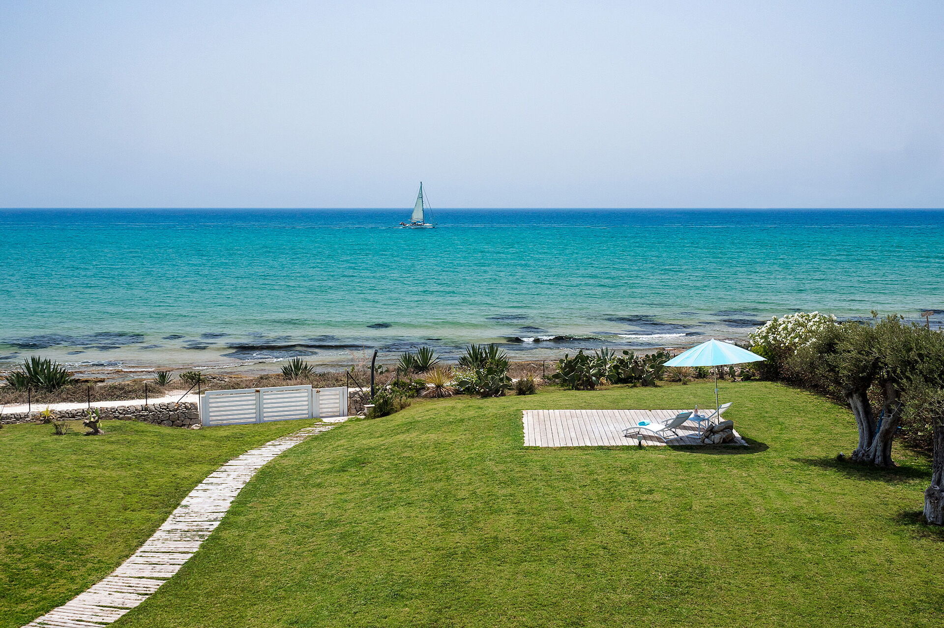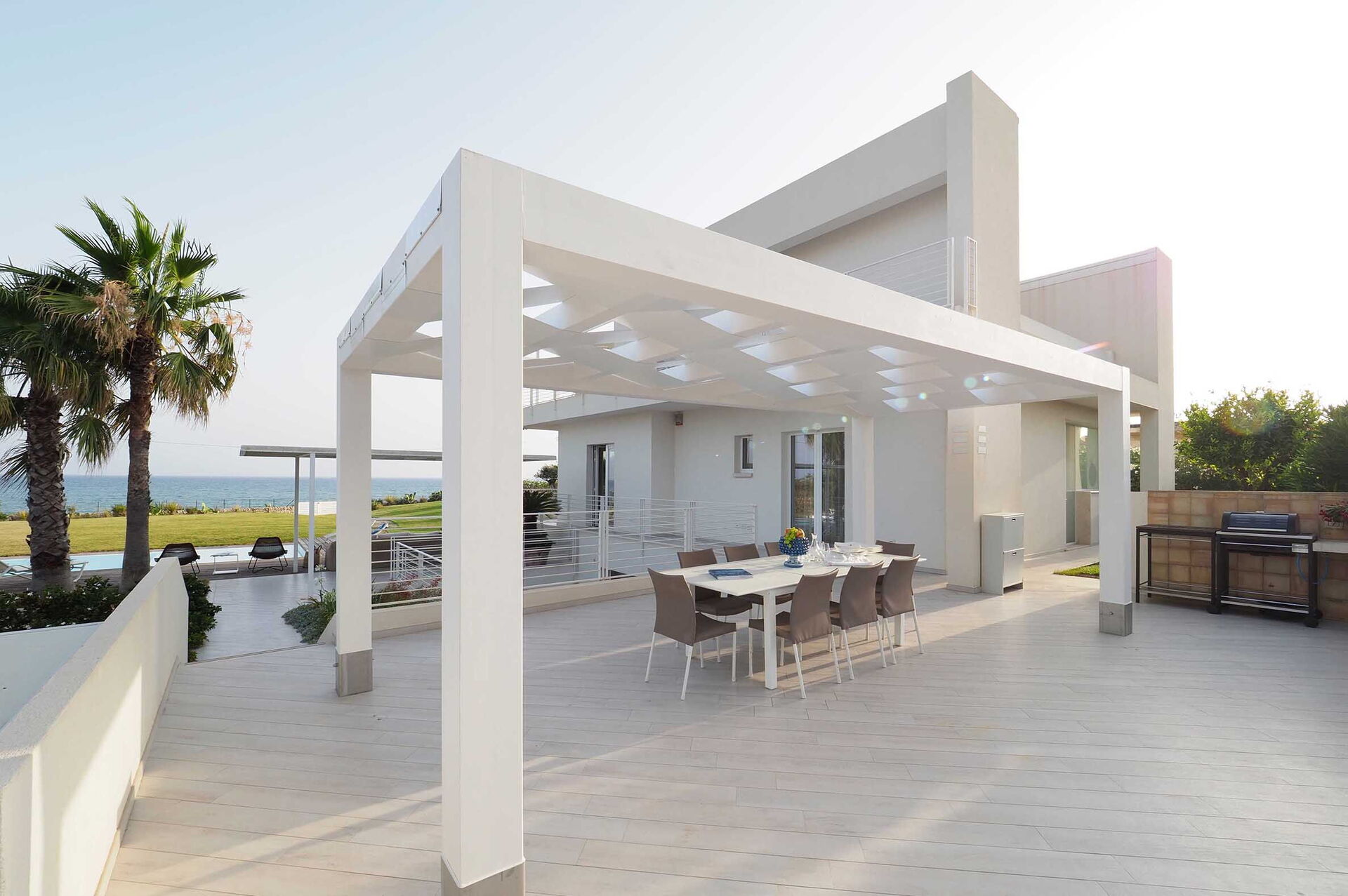 Casa Mareblu is a beautiful and modern villa with sauna, hot tub and swimming pool (12x5 m, depth 1.50 m) located on the seafront in Marina di Modica, on the southern coast of Sicily. The house extends over 3 levels and is surrounded by a large well-kept garden with direct access to the sea. Large partially covered terrace, equipped for relaxation and outdoor dining with sea views, barbecue. All rooms are air conditioned. Ideal starting point for visiting the baroque UNESCO World Heritage cities of Ragusa Ibla, Scicli, Modica and Noto, as well as lovely seaside resorts such as Sampieri, Punta Secca and Donnafugata with its nineteenth-century castle.