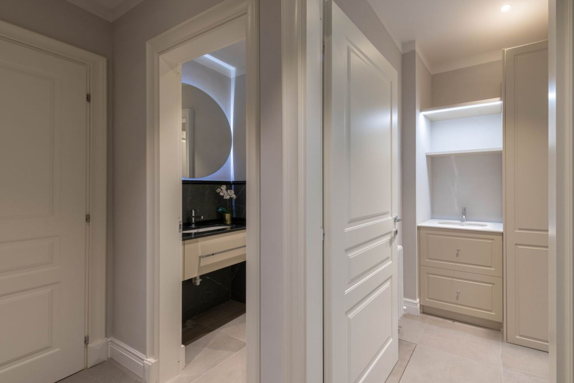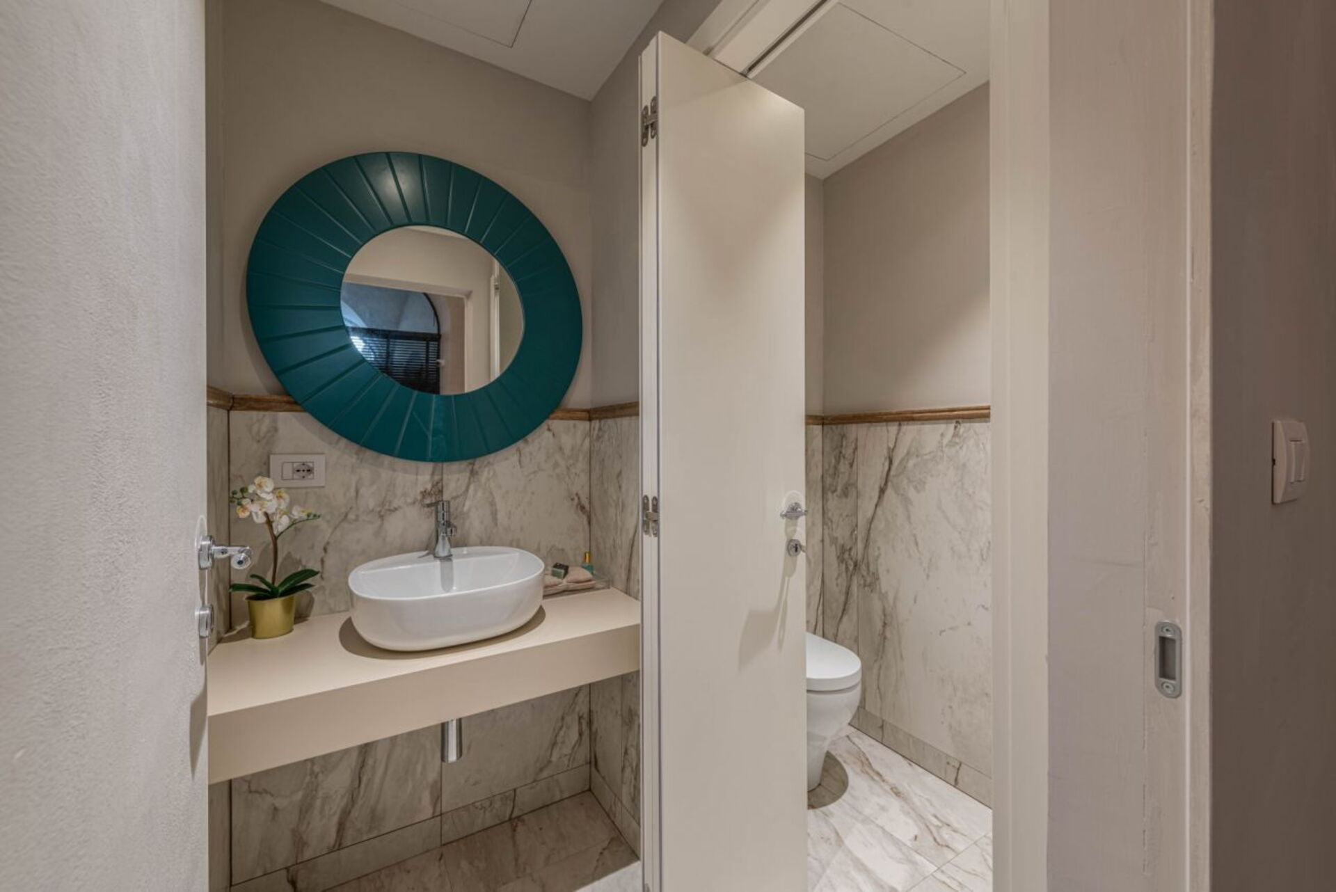Going down a few steps,beyond the dining table,you enter the living room where there are sofas and armchairs of the best Italian designs,impressive LED lighting and a 60-inch 4K Smart TV.