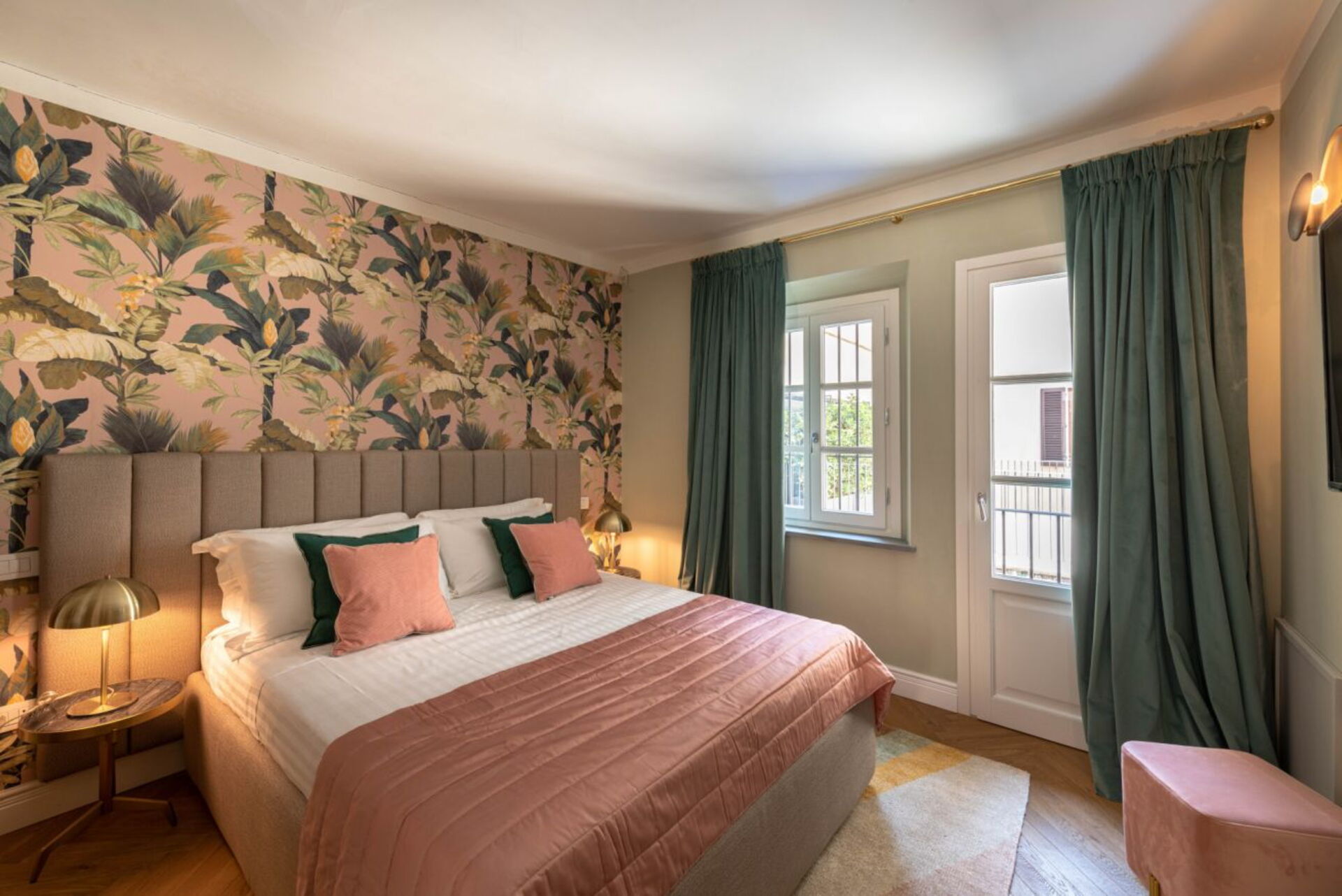Going up to the second floor is the second suite with delightful wallpaper,boiserie headboard bed,25 cm memory foam mattress and always double pillows of different softness.